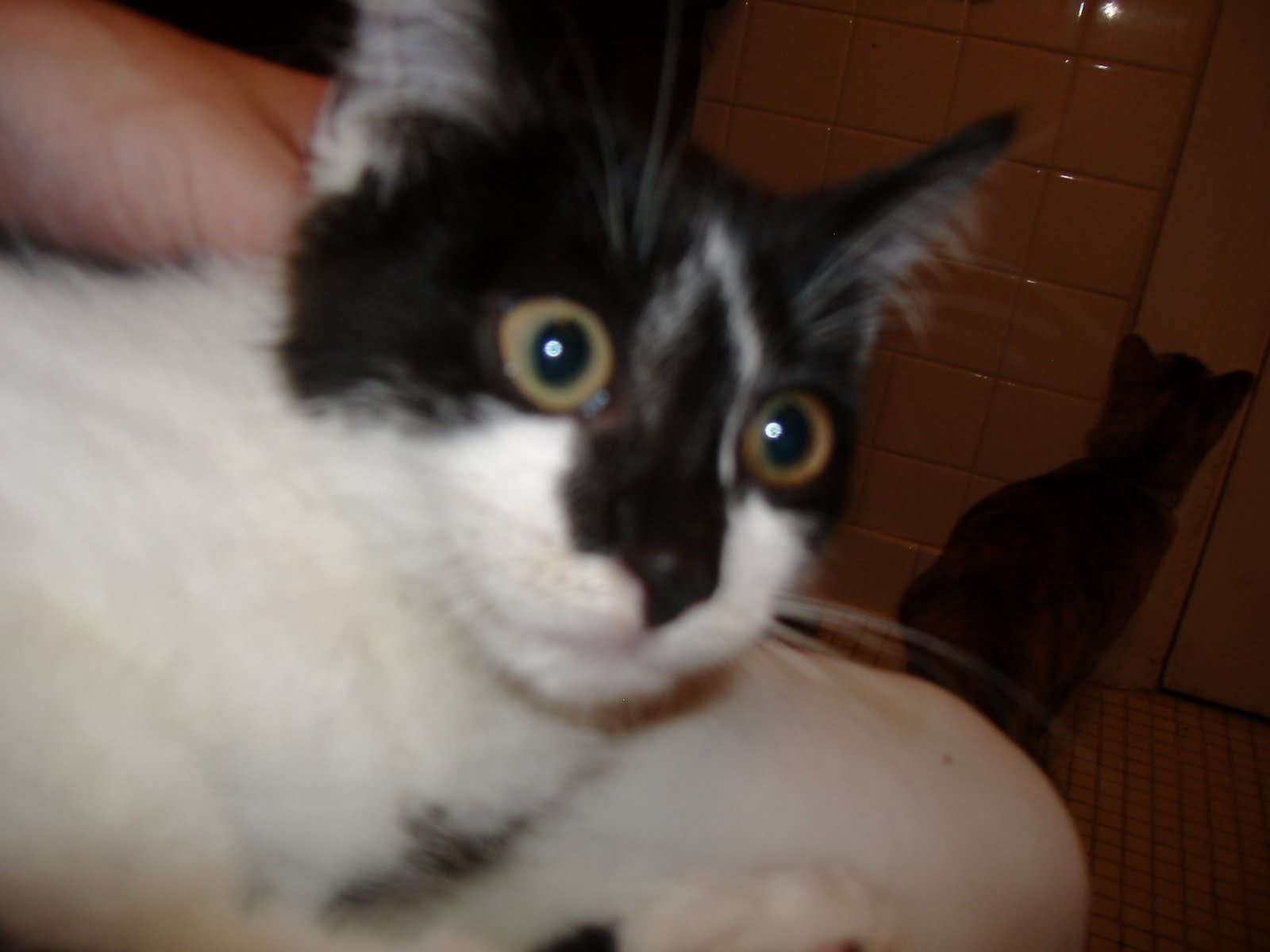 ‘Cici’ was plucked out of a bush this evening on the north side of Syracuse. Just old enough to have been weaned and wandering from mom, but young enough not to be feral yet, it is Cici’s lucky night. She is in a temporary foster home at the moment but can not stay long because there are too many other cats in the foster home already. Cici is approximately 10-12 weeks old. She is a black and white kitten with a handsome white zigzag between her eyes.